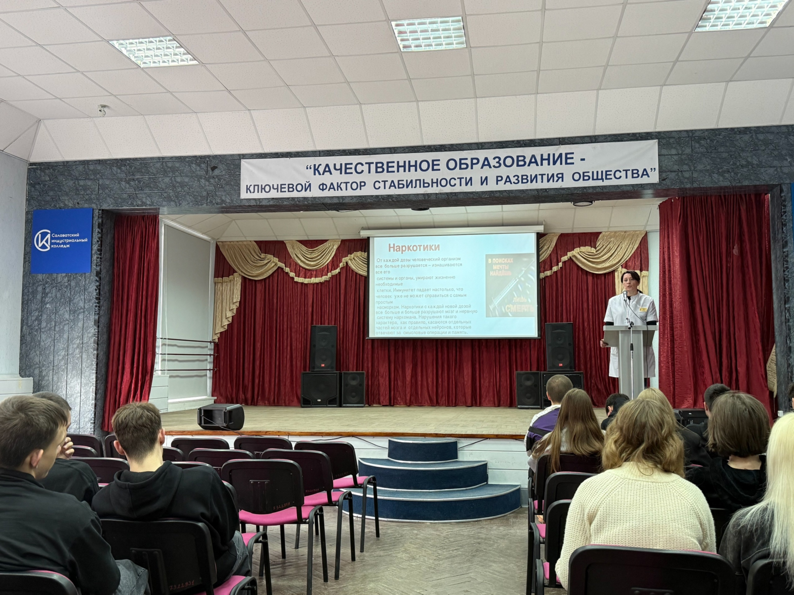 💥 7 апреля 2025 года в рамках классного часа: «Разговоры о важном» в актовом зале Салаватского индустриального колледжа специалистом по социальной работе ГБ города Салават (наркологический диспансер) – Марией Александровной Рафиковой со студентами проведена лекция по профилактике табакокурения, алкоголизма и наркомании, направленная на пропаганду здорового образа жизни среди молодежи.