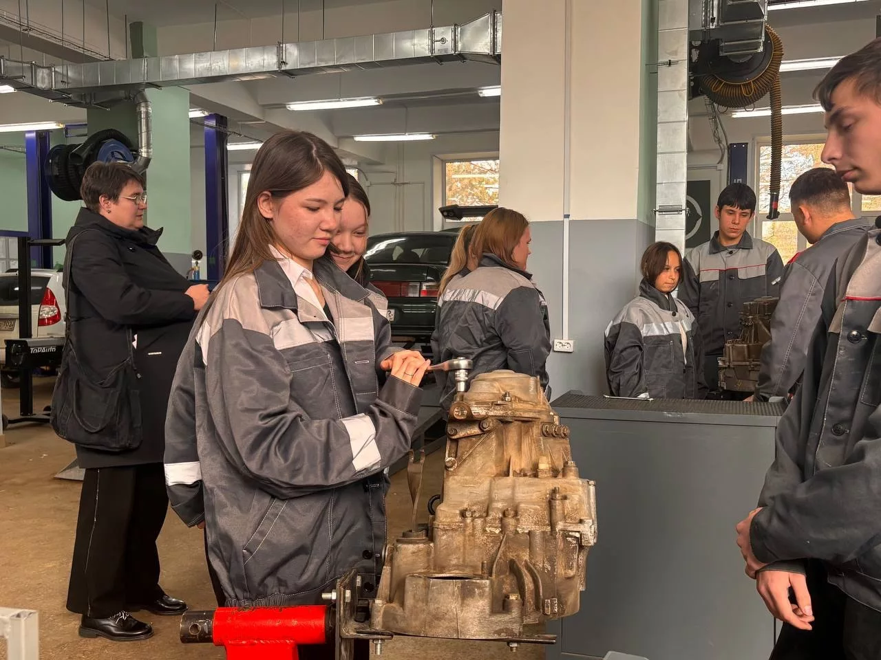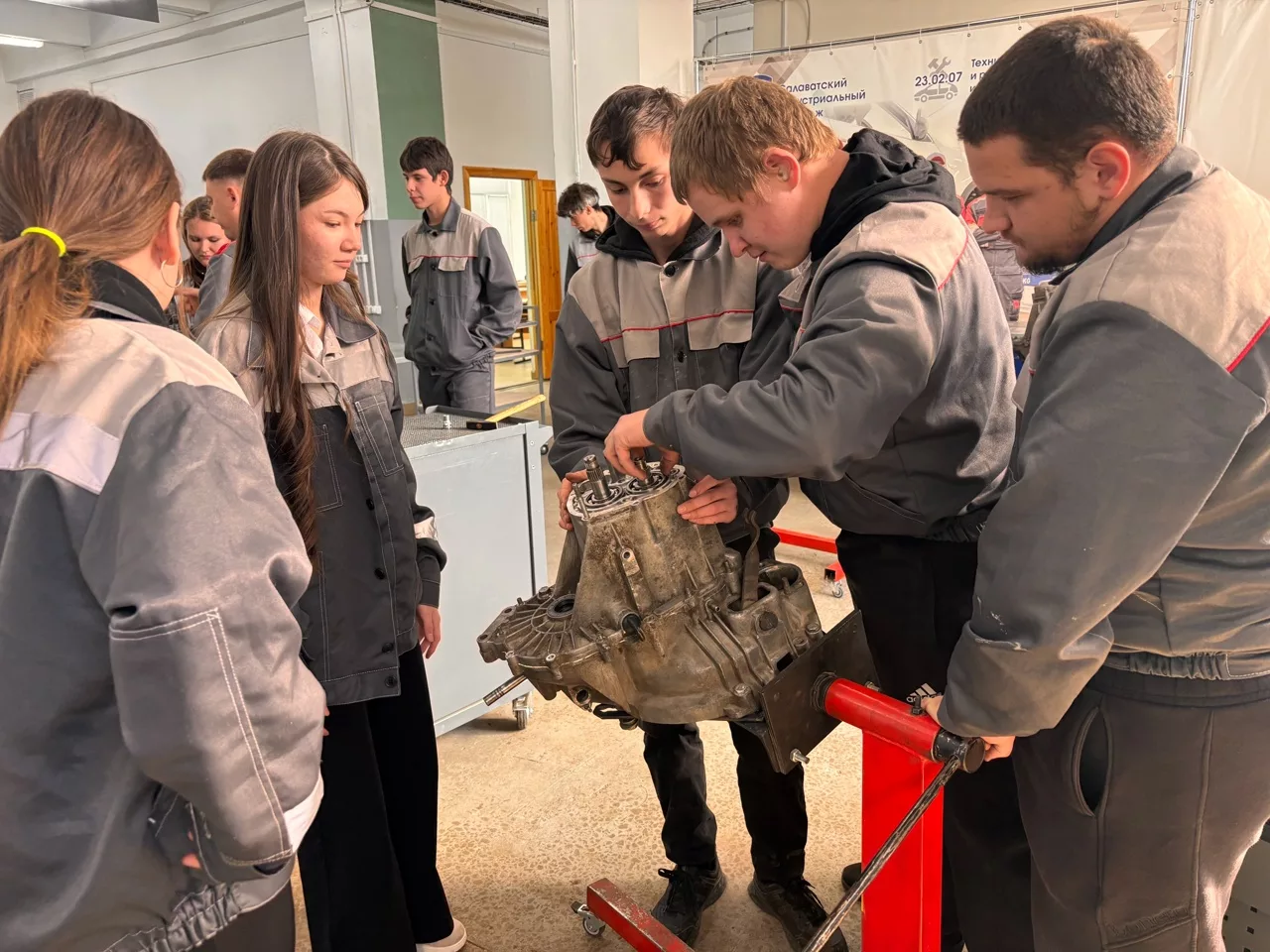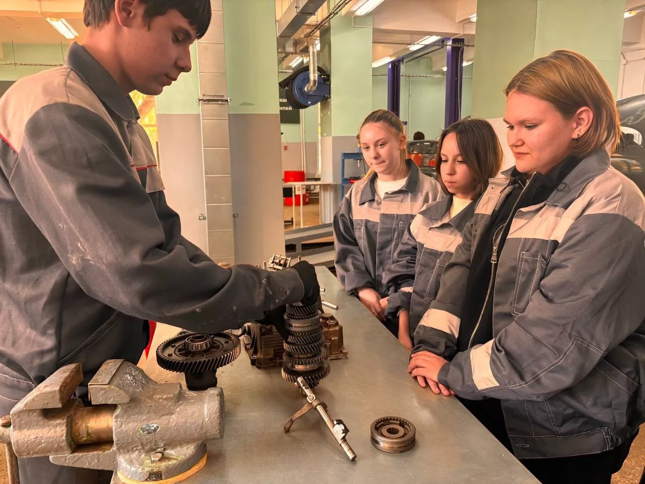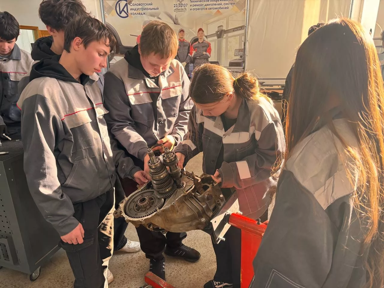 На профессиональной пробе школьники познакомились с профессией Слесарь по ремонту автомобилей. Ребятам было предложено поучаствовать в процессе сборки и разборки коробки передач автомобилей.