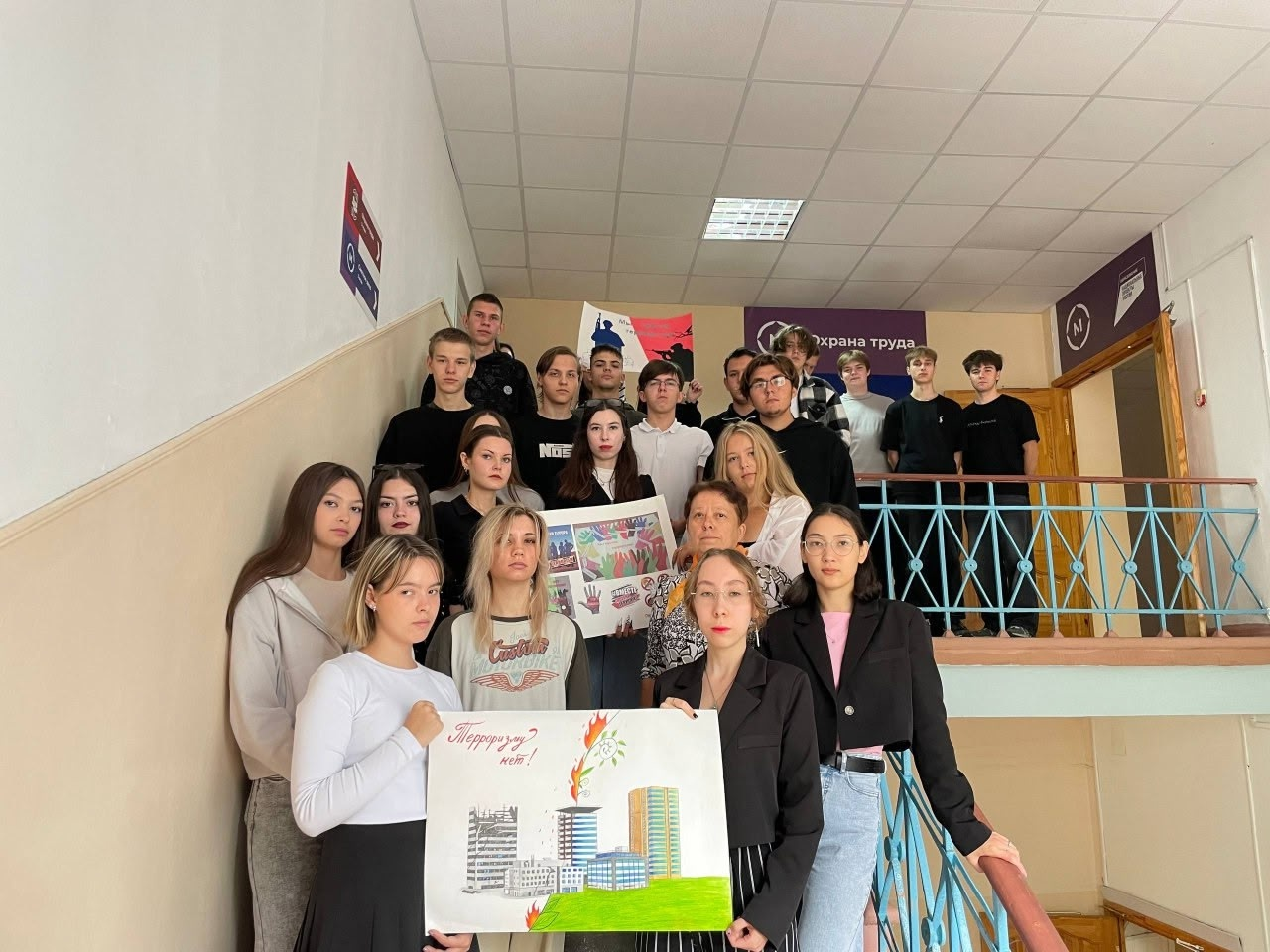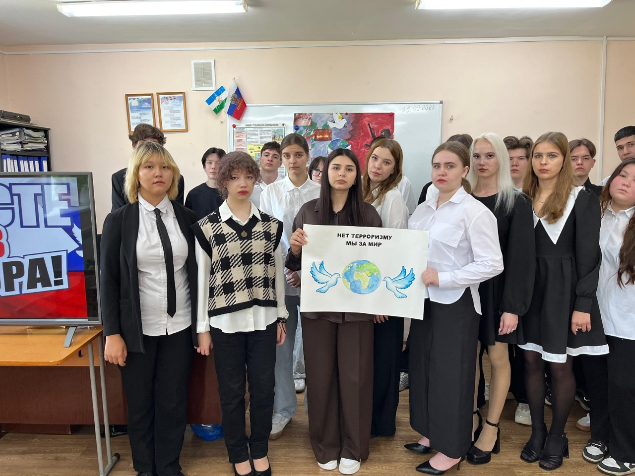 Сегодня в колледже прошли тематические акции Минуты молчания: В память о жертвах терроризма, Выставка плакатов “Мы за мир во всём мире!”