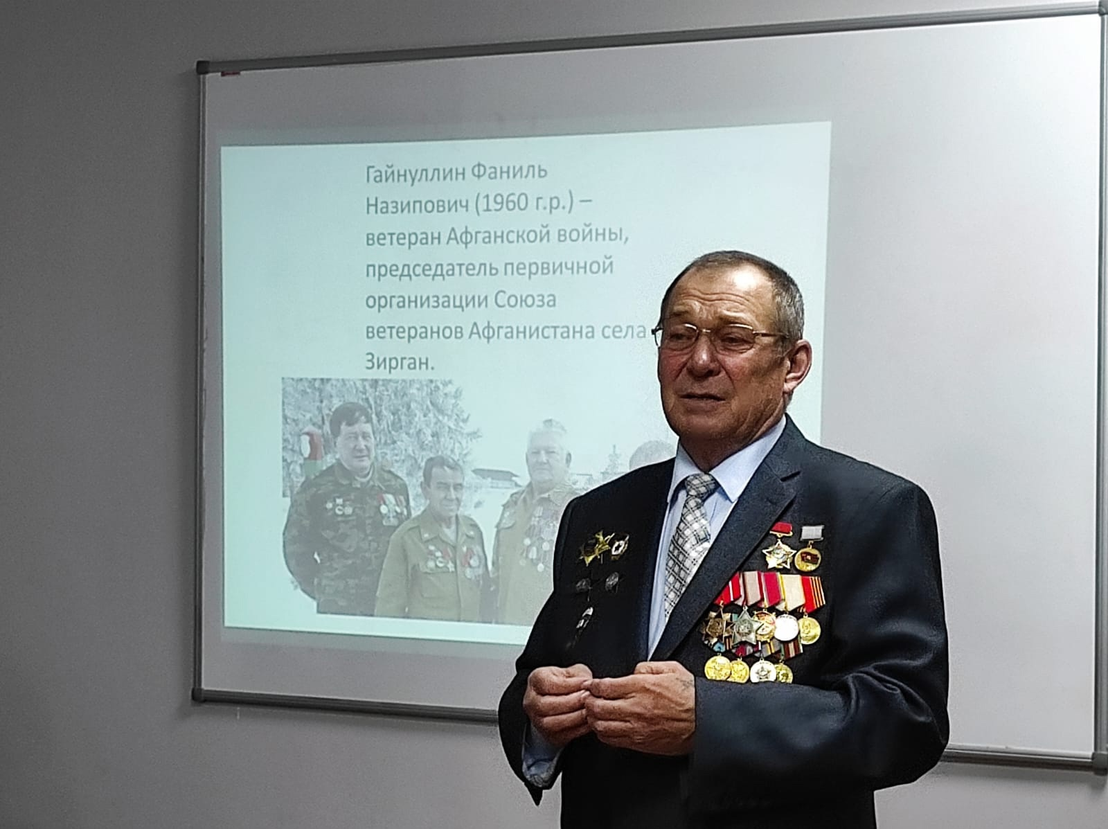 ✅На Урок Мужества под названием “С честью прошел отмеренное судьбой” был приглашен ветеран Афганской войны, председатель первичной организации Союза ветеранов Афганистана в селе Зирган – Ф.Н.Гайнуллин, который выступил перед юношеско-подростковой аудиторией, рассказав о своем военном прошлом.