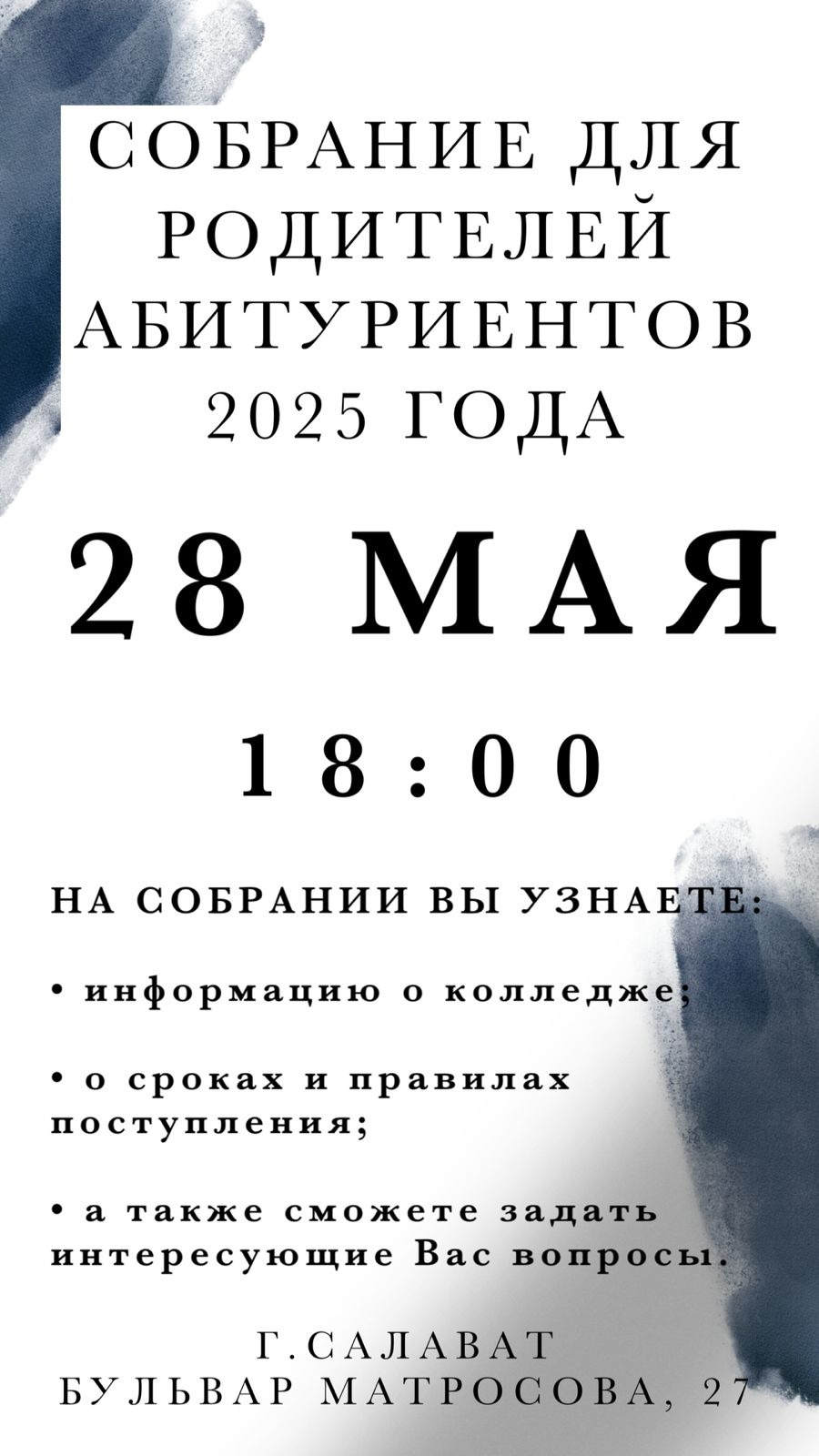 28 мая Салаватский индустриальный колледж организует собрание для родителей будущих абитуриентов 2025 года.